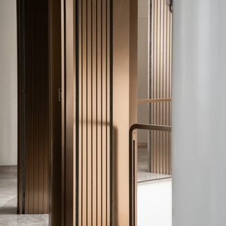 Our material and color palette is intentionally elegant and warm. We've used a sophisticated combination of warm white and bronze tones. The flooring in the public areas is crafted from natural marble, which we have meticulously cut and rearranged into a unique, gradient pattern. This process creates a seamless, polished surface with a distinctive and luxurious grain. For the walls, we chose a special art paint that has a handcrafted texture and subtly shifts in color with the changing light, adding a layer of refined detail.